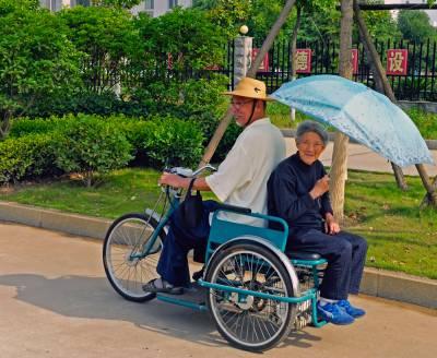 一对老夫妻骑着电动三轮车悠闲地在美丽的新街道边逛,老大爷手包里的收录机中正在播放《幸福万年长》,他们陶醉了! 视界网/邹小平