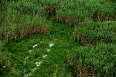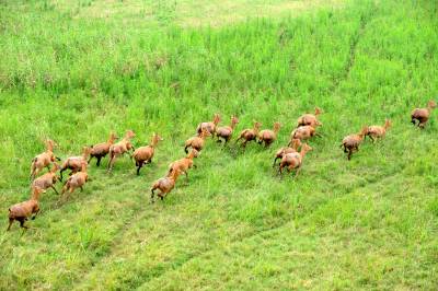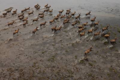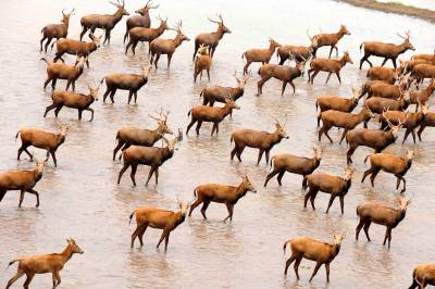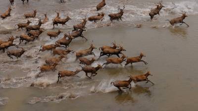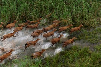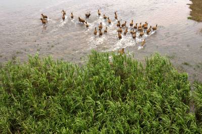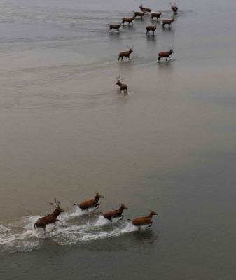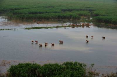 石首麋鹿自然保护区成立于1991年11月,1998年8月经国务院批准晋升为国家级自然保护区,现在麋鹿种群64头发展到近千头,且全部实现了自然放养,恢复了野生习性,成为目前世界上最大的麋鹿野生种群。保护区以其良好的湿地生态环境、丰富的生物多样性、成功的麋鹿野生繁育赢得了国内外专家学者的赞誉,引起了社会各界的广泛关注。(杨发维 摄于2009年)