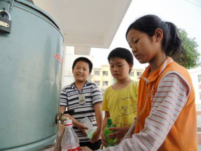 19日郧县刘洞镇九年一贯制学校的学生们正在打开水。针对近期干热的天气,郧县教育局要求各学校全天候为学生提供开水,防学生喝冷水拉肚子,防学生“上火”诱发防腮腺炎、水痘等传染性疾病。(高超 摄)