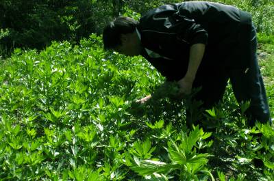 目前,全区中药材种植面积已达1800亩,各地块药材长势喜人,丰收在望。图为药农正在为川乌除草的实况 (段昌林)