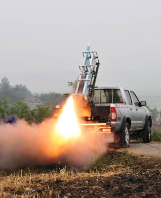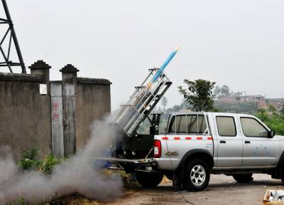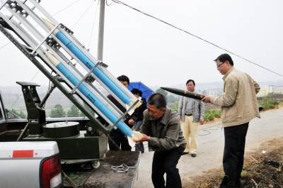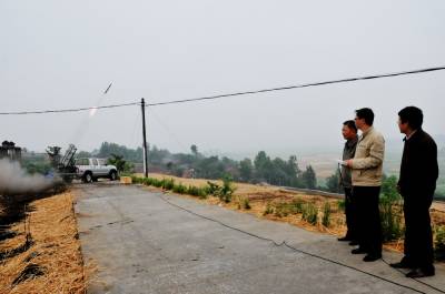 5月21日下午1:10分十堰市的七县市陆续进行了大规模的人土增雨作业,仅郧县四个作业点共发射37型增雨炮弹120发,增雨火箭16枚,十堰市普降小到中雨,截止发稿时下雨最大的竹溪县降雨量达27毫米,郧县最大降雨量达12.4毫米,降雨还在继续,通过实施笫二次大规模的人工增雨作业以缓解十堰市50年一遇的旱情。 图为郧县火箭增雨发射架正在向雨云发射火箭弹时的情景。 周家山摄 郧县城管大队 电话13872840078 邮编442500