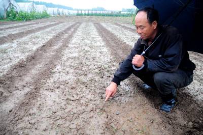图二:昨日的一场及时雨,使该村的菜秧吐出新芽。图三:昨日下了一天的雨使该村大棚菜地的沟渠积水,村民及时打开新建的起闭闸放水,防止内涝。