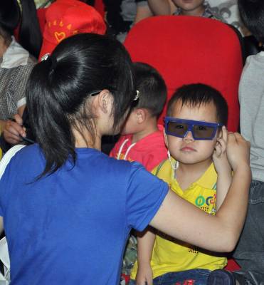 46名来自恩施市聋哑语言听力康复中心的聋哑儿童,在39名湖北民族学院志愿者的陪同下走进电影院看电影。位于民院学校旁的小型电影院为孩子们提供专场,播放了3D电影《阿凡达》。孩子们戴着助听器、3D眼镜聚精会神地观看了电影,精彩的画面让他们很开心。