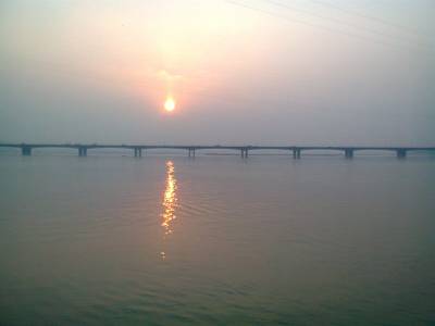 落日与长虹大桥、汉江三者融为一体,甚为美。