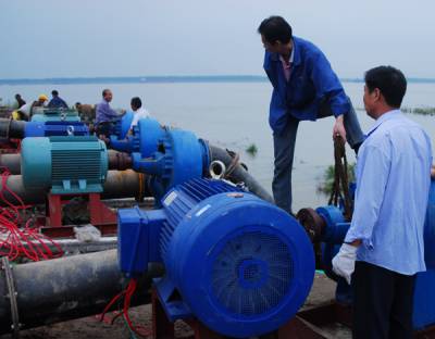 5月31日,武穴市武穴大闸江边,10台70千瓦\时提取长江水抗旱的大型抽水机一字排开,每小时提取17000立方米江水注入联通该市武山湖、太白湖的官桥大港、丰收大港,使5个镇处、15万亩稻田得以缓解。 针对武山湖区、丰收港沿线10多万亩稻田出现的严重旱情,武穴市委、市政府于5月27日决定启动在武穴大闸处提取江水抗旱,使15万亩稻田得到及时抢插、抢管。 本报视界网 冯怡红摄影 通讯员俞胜摄影报道
