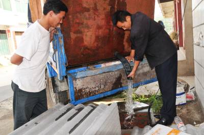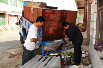 6月1日上午,十堰市郧县谭山镇严岭村一组村民梁吉云正在将100元购买的一农用车水放入自家水窖里,他家一年需用1200元买12车水才够一家人使用。谭山镇共有18个村,去年秋季至今夏五十年一遇特大干旱使村民水窖已无雨水可接,家家需买1200元钱水才能渡过大旱之年。 图为严岭村一组村民梁吉云(右)正在将100元购买的一农用车水放入自家水窖里时的情景。 周家山摄 郧县城管大队 电话13872840078 邮编442500