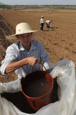 老河口市竹林桥镇王李岗村李则尧和家人开着拖拉机运水到田头,给棉苗逐个浇水。据介绍,襄阳市48万人采取各种取水抗旱,尽最大努力减少干旱给农业生产带来的损失。 (记者 杨平 摄)