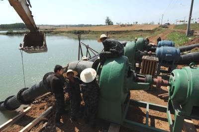 1日,老河口市孟桥川水库架起4个大型水泵,流量达到5立方米/秒。连日干旱,水库低于闸口,工作人员只能架设临时泵站提水进入灌溉水渠,为当地提供抗旱水源。 (记者 杨平 摄)