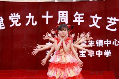 6月1日上午,由竹山县宝丰镇中心学校主办、宝丰中学承办的的融观赏性、参与性、艺术性、趣味性于一体的庆祝建党90周年文艺演出活动隆重举行。本次活动有全镇中小学、幼儿园18个代表队参加,共有大合唱《歌唱祖国》、舞蹈《桃花朵朵开》、表演唱《八唱党的政策好》、快板《宝丰中学喜事多》等24个精彩节目上演。热情洋溢的节目充分展示了广大师生昂扬向上的精神风貌,是学校落实素质教育、艺术教育、生本教育的重要体现,丰富了校园文体活动,强化了同学们自我锻炼、自我升华的意识,增强了凝聚力和向心力,更表达了广大师生热爱党、赞美祖国、建设祖国的满腔豪情。图文精彩纷呈的文艺演出。
