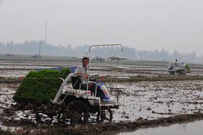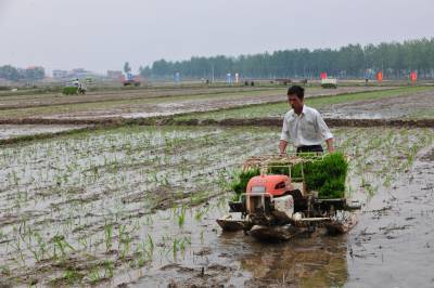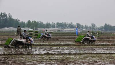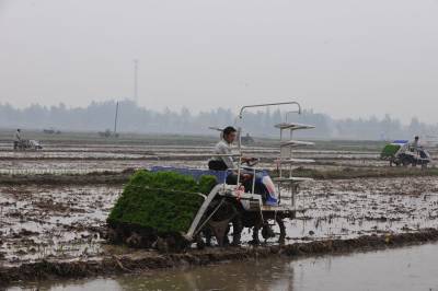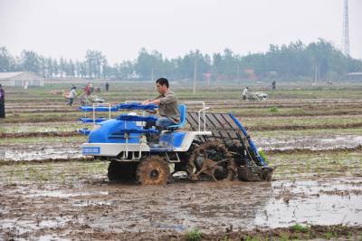5月30日下午,在湖北省襄阳市襄州区张家集镇邵棚村1组,大型插秧机对整理出来的水田进行抢插,确保水稻机械化插秧整村推进和种植质量。 当天,湖北襄阳降下一场及时雨,遭遇特大干旱的襄州区张家集镇农民抓紧时机,千方百计抗旱插秧保丰收。农业部门协调组织各种插秧机械,保证插秧的进度和质量,确保完成水稻种植面积的完成。