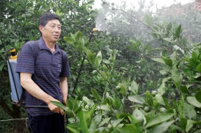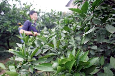 由于近段时间的干旱,宜昌市夷陵区鸦雀岭镇的大片柑橘树落果严重。2日,该镇东山村二组张学华在自家的柑橘进行护树保果,他向记者介绍:“往年自家的200多棵柑橘树能收获2万斤左右的柑橘,今年柑橘经受了冰冻和干旱的影响估计只能收获6千斤左右,据目前的情况看年底柑橘价格会比去年有所上升。希望通过现在的后期管理减少落果,能减产不减收”。 刘康 摄