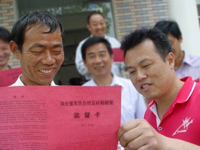 6月1日,鄂州市泽林镇涂桥村21组的村民们高兴地领到了镇财政所发放的《2011<湖北省农民负担及补贴政策>监督卡》。近日,泽林财政所将会把2万余份监督卡送到全镇农户手中,帮助他们明确国家惠农政策,参与监督政策执行,确保自身权益。 郑博 晏三忠 摄