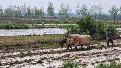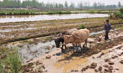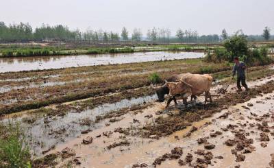 6月3日,在湖北省襄阳市樊城区牛首镇上堰村,农民正对刚刚灌水的麦田进行整理,准备插秧。持续干旱,让该镇大部分田地无法插秧,他们采取措施,打机井抽水,从堰塘提水等措施,利用一切水源,保夏种,包丰收。