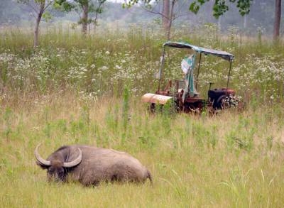 6月3日,黄梅下新大源湖边的水田里,因为缺水,本来是“犁耙水响”的耕种时节,水牛却悠闲地躺在长满杂草的干田里,“铁牛”也闲置一边。