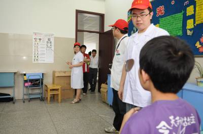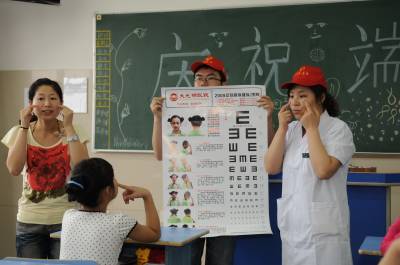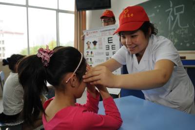 (文图 韩毅)6月3日,在第16个全国“爱眼日”前夕,湖北省宜昌市中心人民医院的青年志愿者来到市特殊教育学校,为该校的聋哑儿童检查视力,向老师和聋哑孩子讲解眼睛保健知识。据该校副校长祝志峰介绍,聋哑孩子因为失去了听觉和语言交流的能力,视觉便成为他们赖以生存的基础,所以呵护好这些孩子的“心灵之窗”便显得犹为重要。