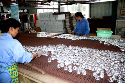 7月11日,湖北戈碧迦光电科技股份有限公司的工人正在检验刚刚下线的水晶工艺玻璃制品。