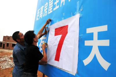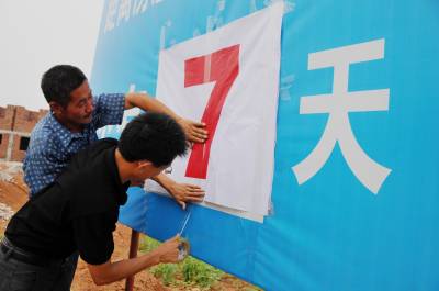 7月13日一大早,十堰市郧县梅铺镇副镇长王尚林就来到曹西沟村移民点建房倒记时牌前更换当日倒计数7天的日期。梅铺镇在丹江南岸,因南水北调中线工程汉江最大的支流丹江江水将倒灌上涨,该村将有58户233人后靠上山,为加快建房速度该镇设置建房倒记时牌以保质保量早日让移民户搬进新房。 图为梅铺镇副镇长王尚林(右)正在更换建房主体工程还有7天的倒计时日时的情景。 周家山 杨文华摄 郧县城管大队 电话13872840078 邮编442500