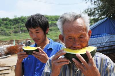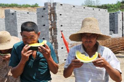 图为郧县移民局工会主席杨文华(右)为安阳镇小细峪移民点送西瓜和统战部为开发区关坡、何家沟2处移民点送西瓜时的情景。