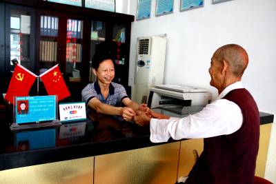 图一:7月14日,今年65岁的秭归县茅坪镇建东村六组村民傅永木老人高兴地在村便民服务中心领取农保资金。