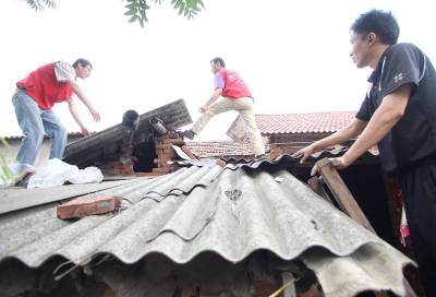 近日,荆门市数名义工来到该市掇刀区白庙街道杨湾路社区为贫困老人王修权修房补漏。前些日子的大雨导致老人破旧的瓦房漏雨,义工们知道情况后,自发购买薄膜等物资,自带工具上门为老人排忧解难。 本报视界网 许中华 摄