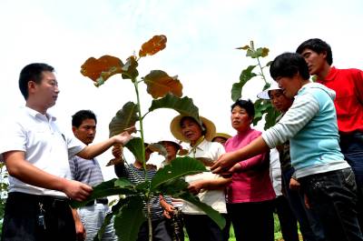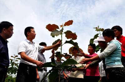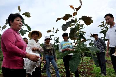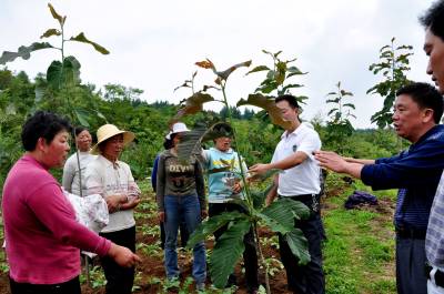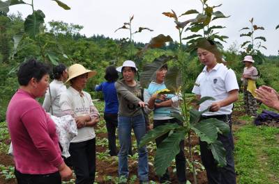 7月15日,恩施市红土林业站技术员在石灰窑村指导留守妇女对紫油厚朴幼苗进行管理。