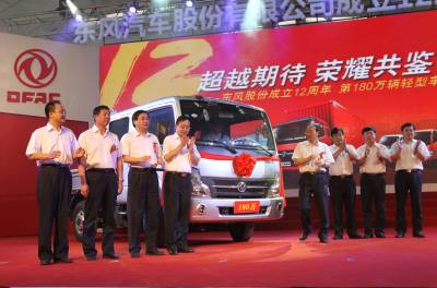 7月16日,东风股份在湖北省襄阳市的基地隆重举行了上市12周年暨第180万辆LCV下线庆典,其生产的轻型商用车销量累计达到了180万辆。东风LCV(轻型商用车)事业板块――东风汽车股份有限公司(简称“东风股份”)经过12年的蓄势和发展,至今已经完成了轻卡、轻型工程车、轻型客车、皮卡、SUV、MPV 、CDV、等全系列LCV产品链的自主研发和基本产能建设。东风LCV年产销量稳居行业第二位,客车底盘居行业首位,皮卡国内年销量居第一。仅今年上半年,在同行业出现负增长的不利环境中,东风股份实现汽车销售近22万辆。