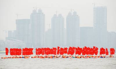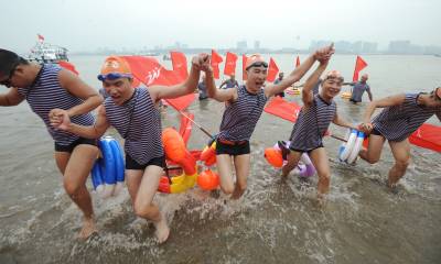 昨日,2011年中国·武汉第38届国际横渡长江活动,在武昌汉阳门江边拉开大幕。今年的渡江活动分为个人抢渡赛和群众方队横渡两部分,来自全国各地的1667名选手组成20个方队参加了群众横渡。武汉渡江活动自1956年兴起,如今已成为武汉城市名片。从2009年起,每年固定在7月16日举行。(记者 柯皓 摄)