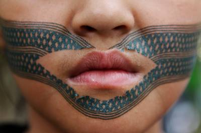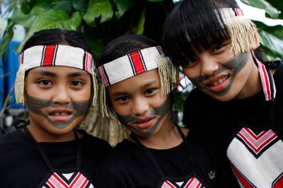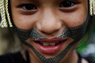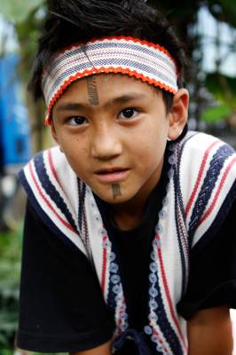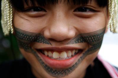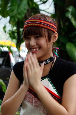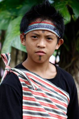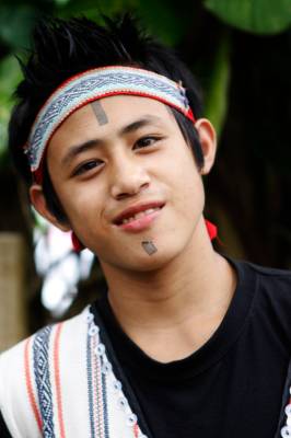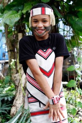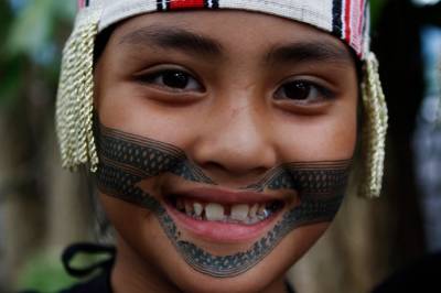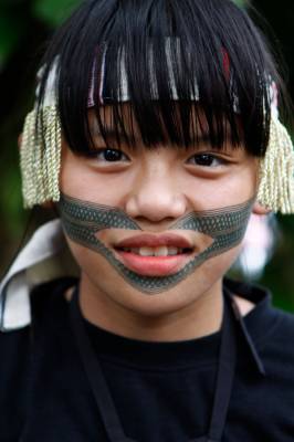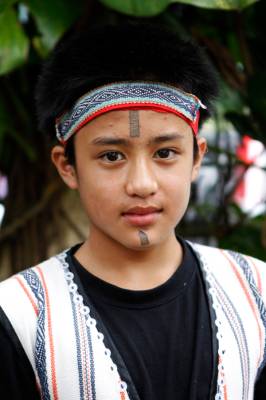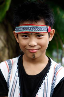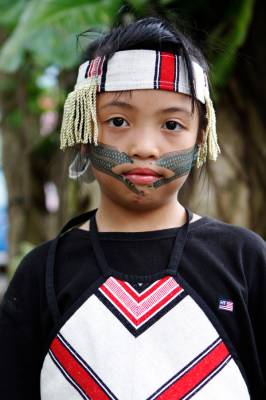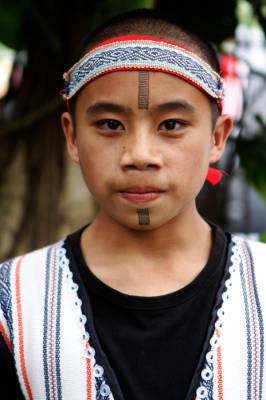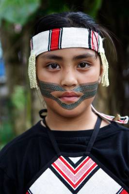 台灣泰雅族原住民〈少數民族〉小學生。泰雅族特有的黥面約莫在上個世紀20年代就已經不復見。部落最年長的黥面長老於2010年過世之後,黥面藝術在原住民部落可說正式走入了歷史。如今的小學生為了在年度的泰雅祭儀歡慶儀式中緬懷先民,特地〈貼〉上了黥面,但此貼可是與先民們用“刺”的方式大大的不同喔!