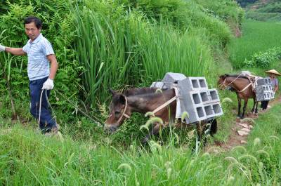7月18日,一支马帮在给恩施州宣恩县李家河乡塘坊村三组建房户驮砖块。地处大山深处的宣恩县李家乡还有很多农民建房等所需材料还得靠人挑畜驮,马帮依然是农民在建设中的交通工具。他们既为新农村建设出力,同时又为自己带来丰厚的收入。据了解,一个马帮人撵上两匹马一年的收入就在4万元左右。(本报视界网陈开银) 联系:宣恩县李家河乡政府陈开银 电话:15027217539