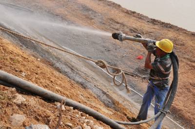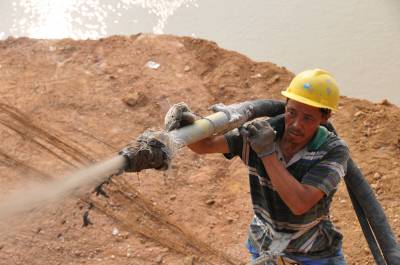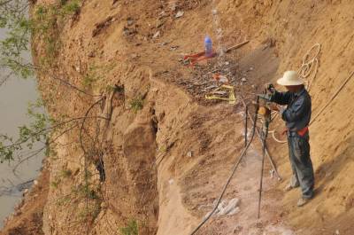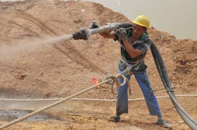 7月18日,建设职工正在高温下采用高压喷浆进行汉江库岸护坡施工。十堰市郧县是南水北调中线工程核心水源区的坝上第一县,为赶在畜水前完成丹江口库区郧县城区汉江堤岸防护工程,各标段正在汉江北岸全长4587.62米的范围内加班加点建设护岸工程,现己进入护坡堤岸建设,该项目总投资4亿元,工期24个月。 图为 7月18日建设者正在高温下采用高压喷浆进行汉江库岸护坡施工时的情景。 周家山 杨文华摄 郧县城管大队 电话13872840078 邮编442500
