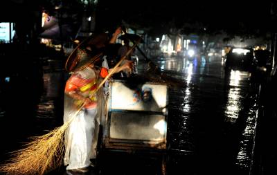 宣恩40余名环卫工人深夜冒雨清淤