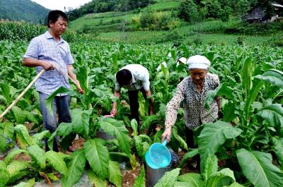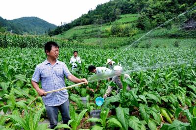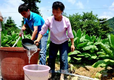 7月19日,恩施市红土乡烟草技术员正在大岩村纸棚沟组协助烟农抗旱保丰收。 七月份以来,持续的高温干旱气候给烟叶后期生产带来不利影响。该站30名技术员树立抗大旱的思想,采取站内组织资金和技术员集资等办法,购回电线、管子、水泵等20台套设备,免费送到连片集中烟产区,指导烟农抗旱。同时,乡农业服务中心用沼液车免费送水到烟田,确保2.35万亩烟叶增产增收。(本报视界网彭绍峰摄)