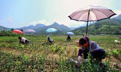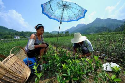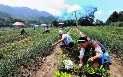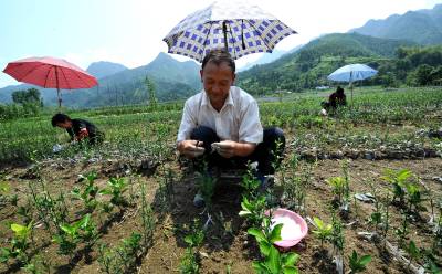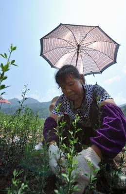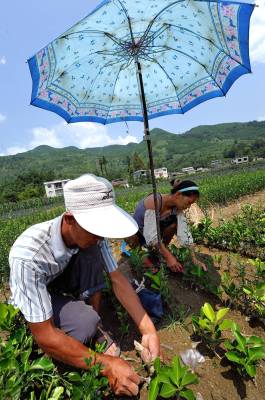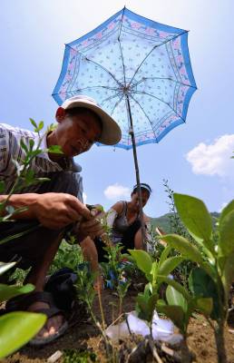 7月19日,宣恩县高罗乡埃山村农民在雨伞遮出的一小块阴凉下嫁接。 时下正值果树嫁接的又一黄金季节,宣恩县的农民们头顶烈日劳作田间嫁接贡水白柚、“宣恩早”蜜柑等果树苗,朵朵“伞花”成为夏日农田间一道风景。 据了解,随着农村产业结构调整使农民对苗木需求量急剧增加,而该县高罗、沙道沟、李家河等乡镇出现大批育苗出售的“专职农民”。他们在满足市场需求的同时也增加了自己的收入。(本报视界网 宋文 摄)