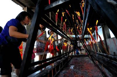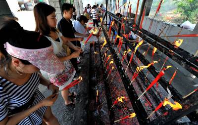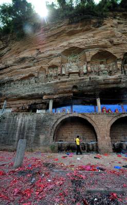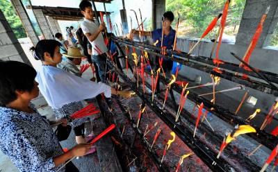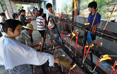 7月19日,人们在仙佛寺内上香祈祷。 当日是农历六月十九,是传说中的观音菩萨成道日之日,湖北、湖南、重庆等地万余群众前往仙佛寺赶庙会。 仙佛寺石窟寺位于来凤、宣恩与湖南龙山县交界处的酉水河东岸,是我国开凿年代最久远的石窟寺之一,距今已有1600多年的历史。每年农历二月十九、六月十九和九月十九,三省边区群众都会前往赶庙会祈祷。(本报视界网 宋文 摄)