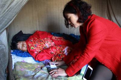 11月8日,竹山县宝丰镇中心卫生院家庭医生服务团队成员袁黎(右)深入该镇桂坪村五组为76岁的签约服务对象操儒菊老人查看病情。据悉,该院组建29支家庭医生签约服务团队,实现“让每个家庭都拥有自己的家庭医生”。家庭医生定期为签约居民提供常见病、多发病的基本医疗服务,“家庭医生上门来”、“送医送药到炕头”已成新常态,家庭医生真正成为群众健康“守门人”。