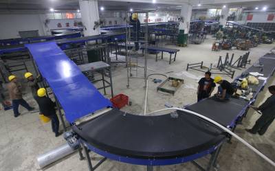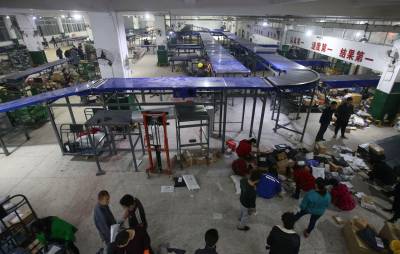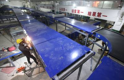 11月9日晚,工人们在襄阳邮政分公司新装双层胶带分拣机。