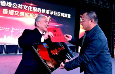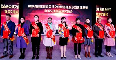 2017年11月8日晚,湖北省南漳县创建省级公共文化服务体系示范区暨首届文明家庭颁奖晚会在该县文化三馆(文化馆、博物馆、图书馆)举行。晚会全面展示了该县创建省级公共文化服务体系示范区成果并表彰了100户文明家庭。近年来,该县以社会主义核心价值观为引领,以创建省级公共文化服务体系示范区为目标,持续加强文化三馆、农家书屋等础设施建设,大力弘扬楚文化、孝文化,均衡配置公共文化资源,人民群众精神文化需求得到有效满足,全县精神文明建设尤其是家庭文明建设取得显著成效。县文明委评选表彰的100户文明家庭,来自全县各行各业、各个镇区,是全县众多文明家庭的优秀代表:有敬老爱亲的典范、热心公益的典范、诚信友善的典范。他们的共同之处,是弘扬和践行了社会主义核心价值观,温暖了人心,诠释了文明,传播了正能量,为全县广大家庭做出了良好示范,成为全县人民学习的榜样。