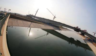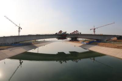 安阳西北绕城高速公路是河南省高速公路网调整规划中的重点建设项目,起于安阳县柏庄镇,向西分别跨107国道、京广铁路和南水北调干渠工程。跨南水北调工程和跨京广铁路转体大桥为全线的重难点工程。在连续1年的施工中,中铁十一局采取严密措施,创新施工方法,确保不让一滴污水、一粒沙籽、一粒焊渣、一根钢筋头、一截扎丝和现场工人一滴汗水掉进南水北调的干渠里,为在南水北调干渠上建设重大设施项目积累了经验。(郑传海、赖成军摄)