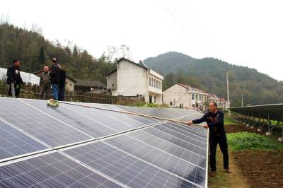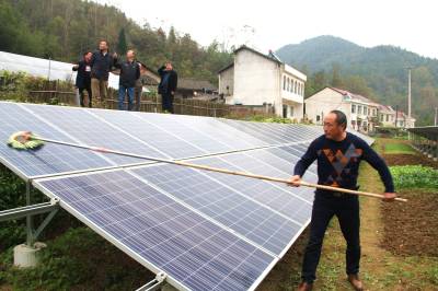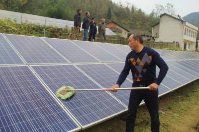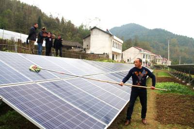 把“阳光钱”装进扶贫农户腰包 11月15日,革命老区谷城县南河镇苏区村村民正在清洁太阳能光伏板。谷城县供电公司积极助力市、县扶贫工作队援建给贫困村的光伏电站并网发电。目前,已并网19个,总发电2481千瓦,累计发电227万度,受益农户达到157户近1000人。(视界网马明刚摄)