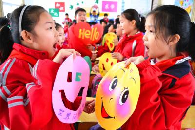 2017年11月20日,小学生在展示问候“笑脸”和问候卡,并互致问候。