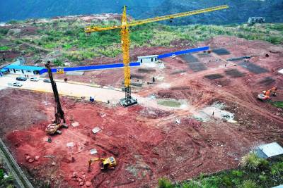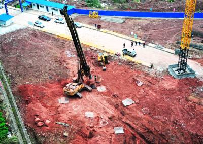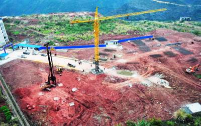 21日,三峡库区巴东县神农溪中小学校教学楼、综合楼施工现场,机械在打桩作业,工人们在焊接钢筋笼。