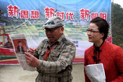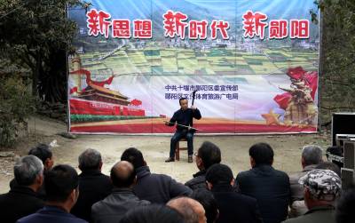 11月21日,十堰市郧阳区文艺宣传小分队在柳陂镇白鹤铺村宣传党的十九大精神。连日来,郧阳区宣传部门创新形式,通过策划创作快板、小品、歌舞、戏曲等群众喜闻乐见的文艺活动,在全区开展进农村、进企业、进校园、进社区巡演,使党的十九大精神家喻户晓、深入人心。(视界网 姬廷顺 孟江 摄13986879800)