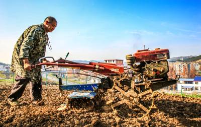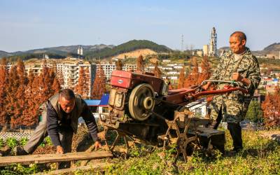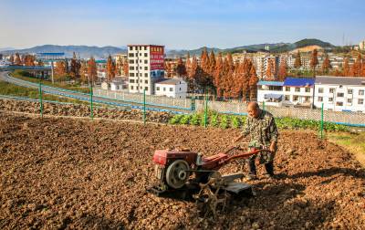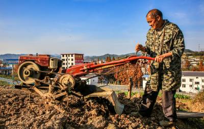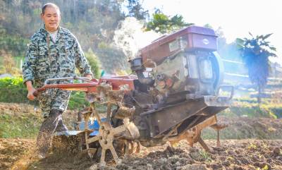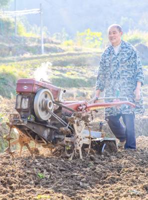 2107年11月23日,竹溪县水坪镇漫液沟村村民柏元平正在操作“铁牛”(农机具)翻耕土地准备播种土豆。 竹溪县是土豆生产大县,是全县农民家庭经济增产增收主要土特产,入冬以来,各地农民抢抓晴天配备农家肥、翻耕、粉碎、平整计划播种土豆土地,力争明年土豆土特产增产增收(视界网温大树摄)。