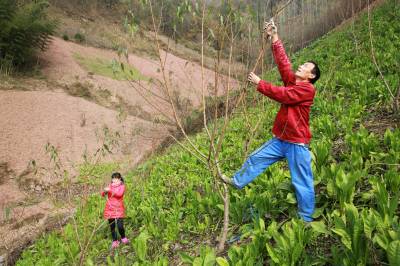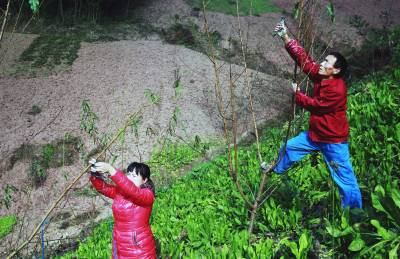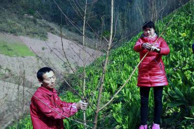 24日,穆经对、何良春夫妇正在管理桃树剪枝压枝。今年48岁的穆经对家住巴东县官渡口镇水坪村五组,是2015年建档立卡贫困户。1996年外出浙江做油漆工,钱没有赚到,却油漆甲醛原因得了病,于2014年返乡。他不等不靠,去年试种黄桃3亩,今年挂果免费让乡亲品尝,得到周边村民认可支持。今年注册“巴东县禾木家庭农场”,贷款10万元流转农田和荒山12亩,引进“世纪黄桃、油蟠17号”等品种,打造观光采摘生态桃园基地。带领10多户贫困户甩掉贫困帽子共同致富。(视界网穆世祝摄)