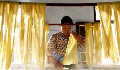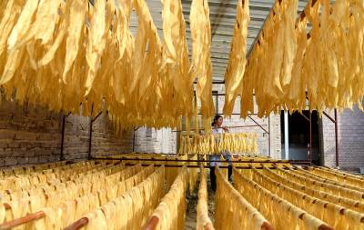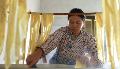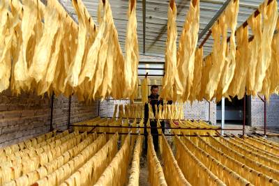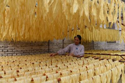 2017年11月27日,湖北省通城县麦市镇山下村民在加工豆皮。 一粒小小黄豆在通城人们巧手“点化”下,经过几道工艺,能加工成豆腐、豆油皮、豆豉 、腐乳、香干等几十个豆制品,黄豆由此增值10到20倍……在通城,黄豆变成金豆的神话已成现实。至目前,全县有近3000人从事豆制品加工,豆制品深加工企业近百家,拉动了农产品加工增值,已形成亿元产业,解决当地千余贫困人口家门口就业。 (湖北通城:一粒小黄豆衍生亿元产业链)