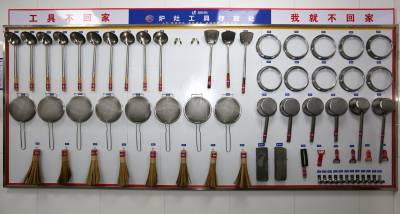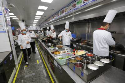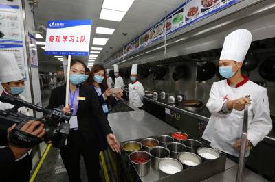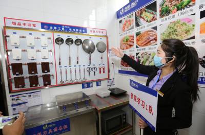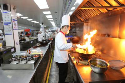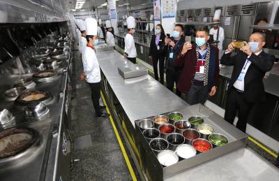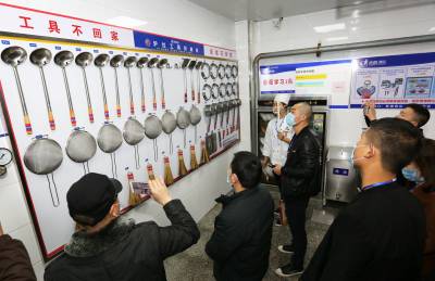 该酒店厨房一改人们对传统后厨的印象,一件件厨具如等待检阅的“战士”,齐刷刷列队“站立”,“炒锅队”“切刀阵”“砧板排”,就连大厨们各自使用的毛巾、水壶都有自己专属的位置,摆放得整齐划一,整个厨房看起来整洁有序。厨房水不落地,地不湿滑,大厨可穿布鞋上班。