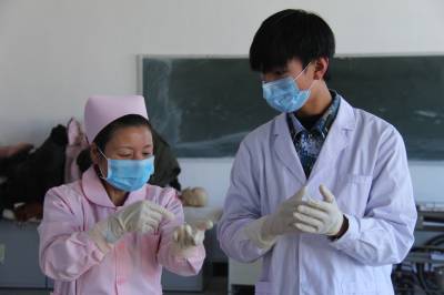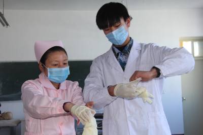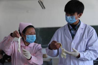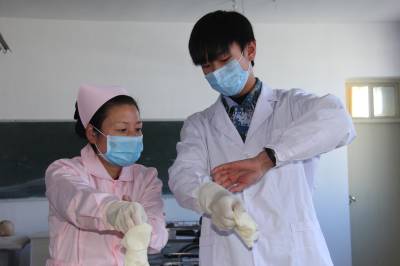 1月9日,丹江口汉江科技学校护理专业老师在手把手指导学生正确使用无菌手套。近年来,该校护理专业不仅对学生进行基础医学、心理学、护理学等基础知识教学,还注重综合素质、人文教育、社会心理学、道德观念等多方面的培养,训练过硬的护理技能,培育爱心和耐心,不断提高专业技术能力。视界网 钱芹 摄 通联:丹江口汉江科技学校办公室:钱芹 电话:13477990812 邮政:442708