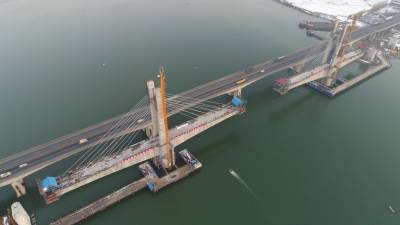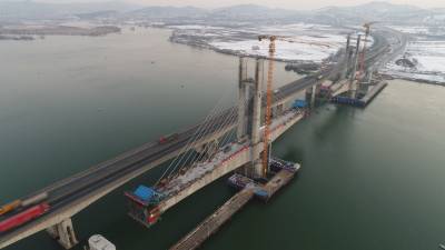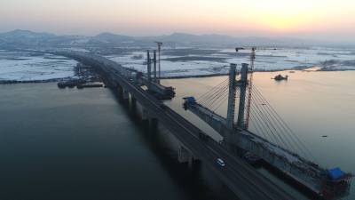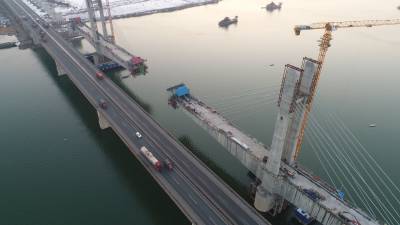 2018年1月11日,在建的蒙华铁路汉江特大桥施工现场,工人们着手安装第六组斜拉索。蒙华铁路汉江特大桥全长5.242千米,横跨汉江襄阳段,该桥主桥采用双塔结构,桥梁上塔高57米,每座塔身两侧各有9根斜拉索,贯穿索塔两端。其中,主桥最大跨径248米,是混凝土结构重载铁路桥中的第一大跨度。