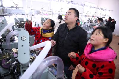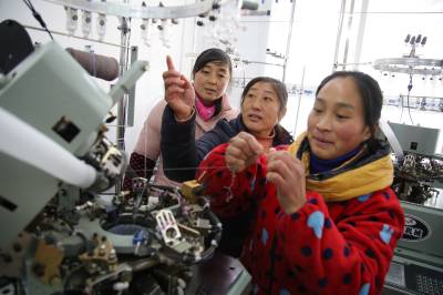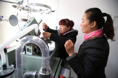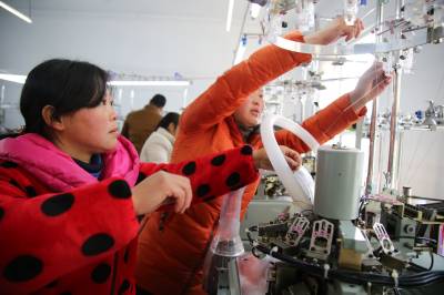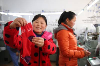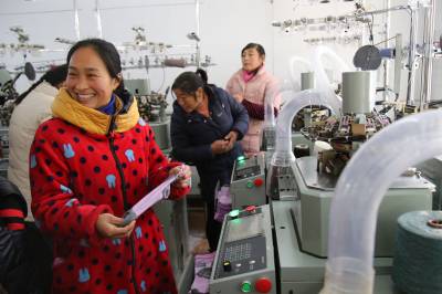 2018年1月14日,在十堰市郧阳区谭家湾镇黄畈村“扶贫车间”里,村民展示机械加工的袜子。
