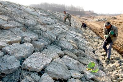 图二:2018年1月14日,施工人员正在房县化龙堰镇郭家河桃园段为格宾网河堤覆盖保护层。